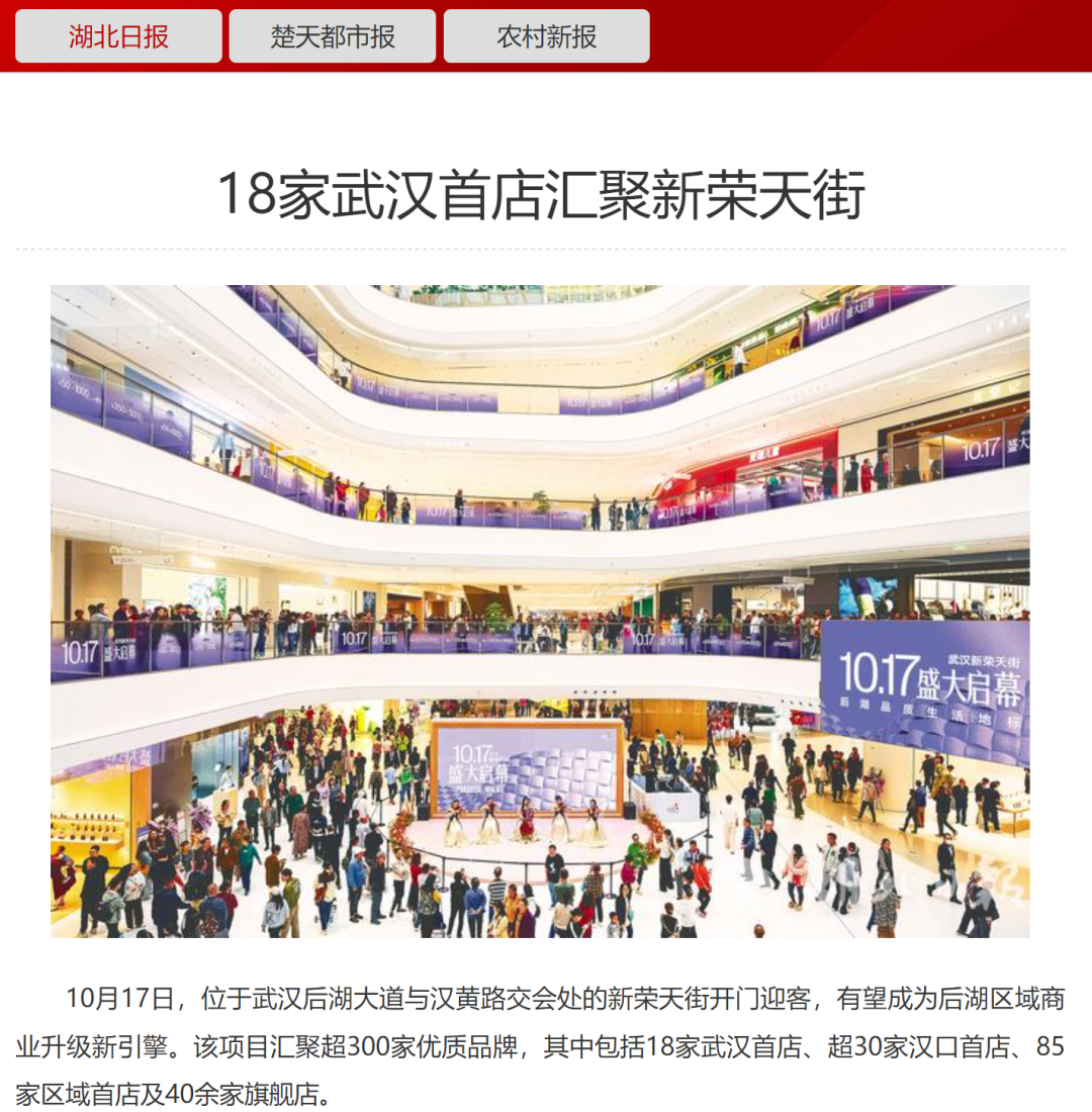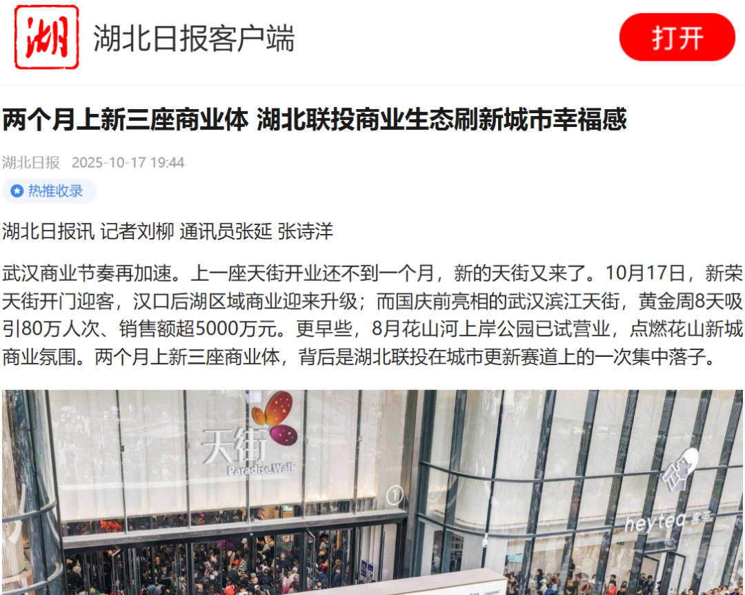 湖北日?qǐng)?bào):兩個(gè)月上新三座商業(yè)體 湖北聯(lián)投商業(yè)生態(tài)刷新城市幸福感