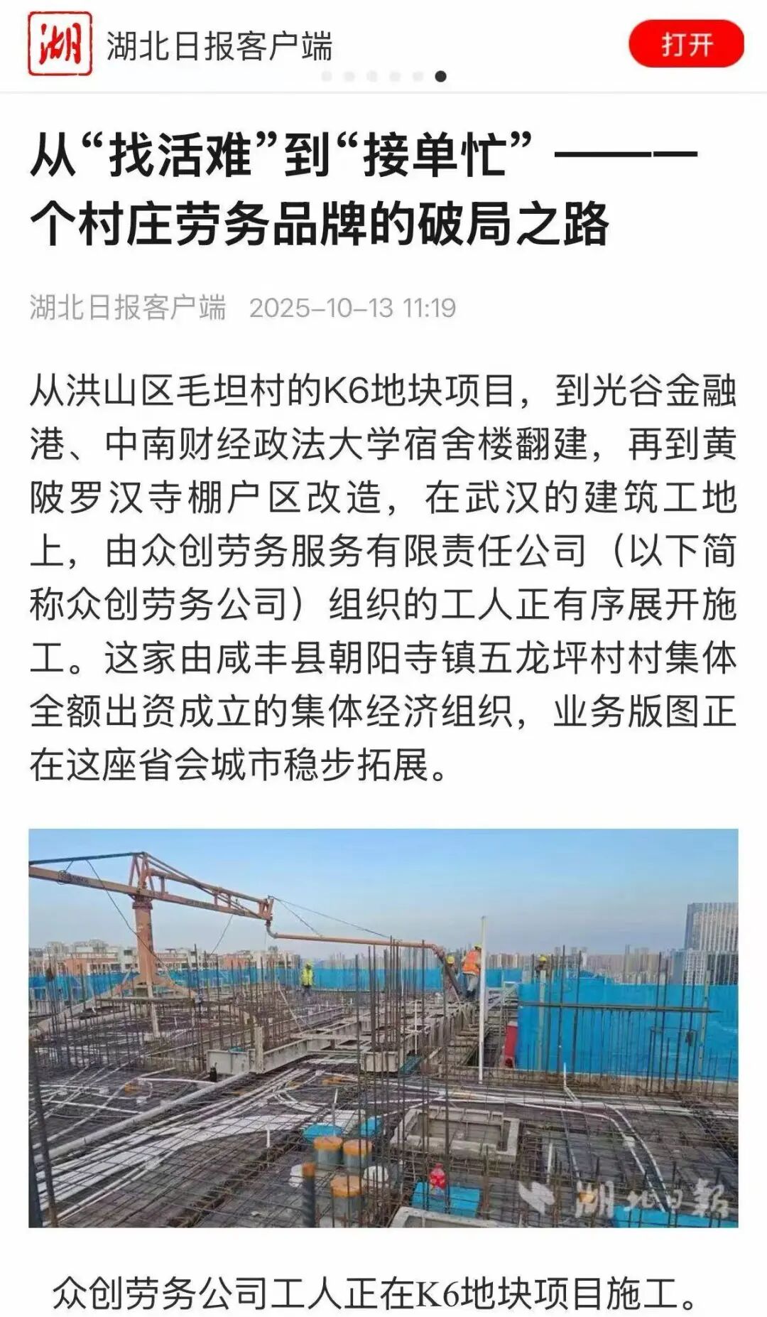 從洪山區(qū)毛坦村的K6地塊項(xiàng)目,到光谷金融港、中南財(cái)經(jīng)政法大學(xué)宿舍樓翻建,再到黃陂羅漢寺棚戶區(qū)改造,在武漢的建筑工地上,由眾創(chuàng)勞務(wù)服務(wù)有限責(zé)任公司(以下簡(jiǎn)稱眾創(chuàng)勞務(wù)公司)組織的工人正有序展開施工。這家由咸豐縣朝陽寺鎮(zhèn)五龍坪村村集體全額出資成立的集體經(jīng)濟(jì)組織,業(yè)務(wù)版圖正在這座省會(huì)城市穩(wěn)步拓展。